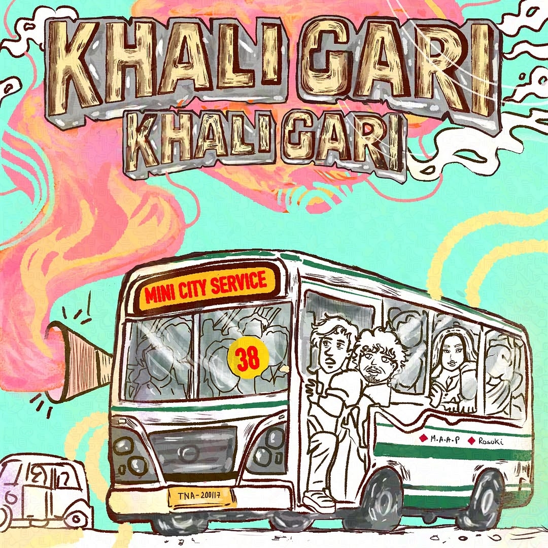 The single’s cover art (illustrated by @doeremiii) captures the spirit perfectly: a crammed Mini City Service bus (Route 38) rattling through the city, Rosoki and M.A.A.P hanging by the door, ready to take you on board. The Khali Gari is stopping, are you getting on?